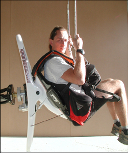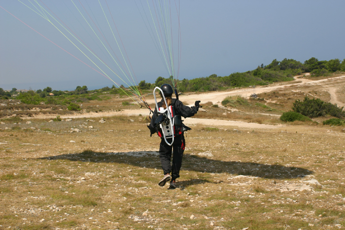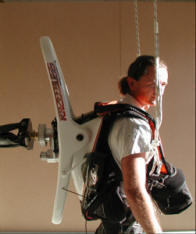 1. Motor & folding prop. 2. Power pack. It's worn on front which better balances the motor so hang points can be more like a free flying with low hook-in points. Specs are: Engine: HPD 10 developed by Werner Eck and Joachim Geiger. More info here. Battery: 12-cel (48v) 40 Amp-Hr Kokam Lipo Thrust: 77 Lbs. Note that in 3 months they plan on offering a 14 cell (58v), 32 Amp-Hr arrangement that will have just under 100 lbs of thrust. Weight: 37 lbs paramotor, 29 lbs battery, total weight 66 lbs. Endurance (Full Power): 17 minutes. Cost: US $15,000, extra battery is US $4600 (using exchange rate on 10/01/2009).